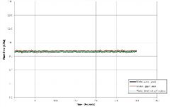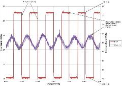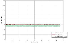 The Coriolis flow meter used for the test provided a frequency output signal, producing a 50% on/off square-wave function between 0.5 VDC and 22.5 VDC. The number of on/off cycles produced by the meter per unit of time is proportional to the flow passing through the meter. While operating at the conditions outlined above, the signal from the flow meter was inspected for distortions of voltage values, shape of the output function and the timing of each signal step over time. Other than minor pressure and flow fluctuation that were within the expected values of the system, no significant output-wave from distortions were found. Figure 2 and Figure 3 show samples of the results.
