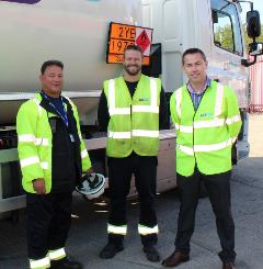 After searching for a solution for more than eight years, Mark Allcock, right, Managing Director for Meller Flow Trans, was able to supply the team at Flogas – including Depot Manager Gary Rolfe, middle, and Mini-Bulk Driver Paul Ward, left, – with a reliable metering system featuring the Flowcom 2000 and Blackmer® cargo pumps.