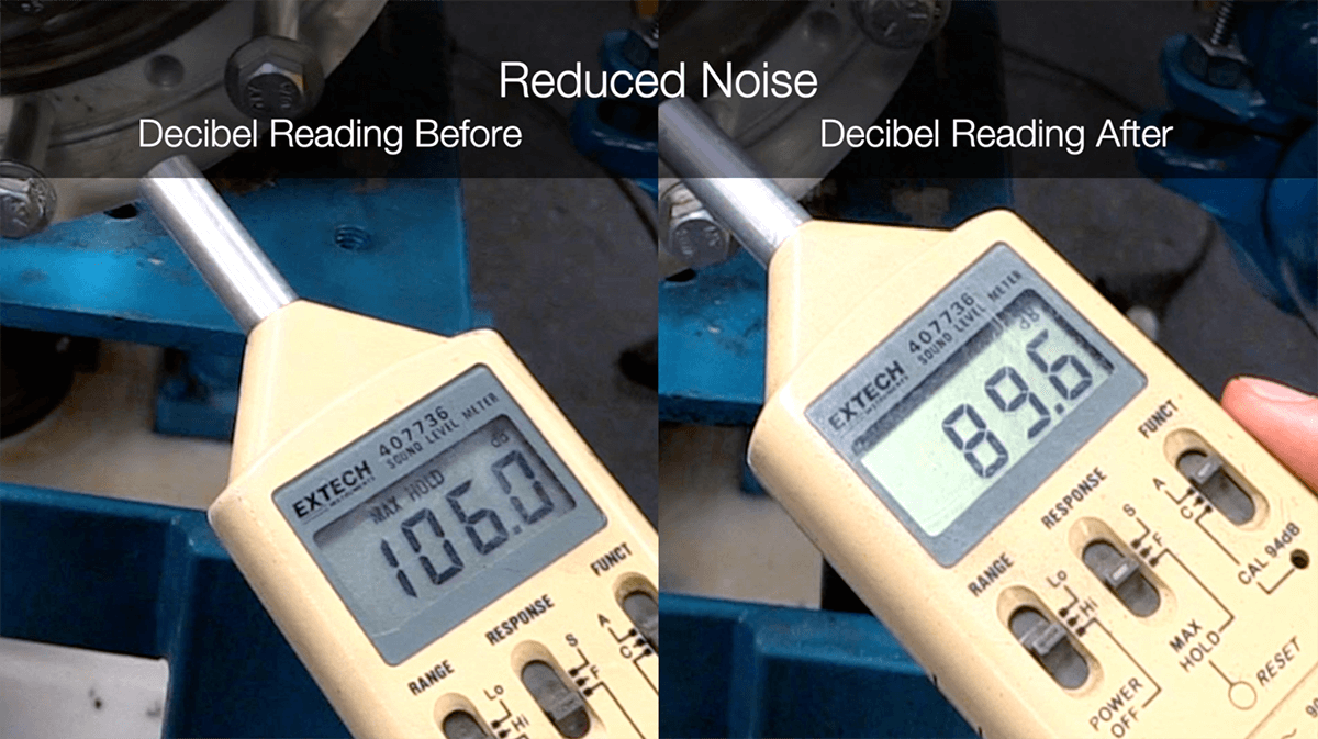 The pump operating without a Cavitation Suppression Liner produced a noise level of 106 decibels (left) compared to 89.6 decibels for the pump with a Cavitation Suppression Liner.
