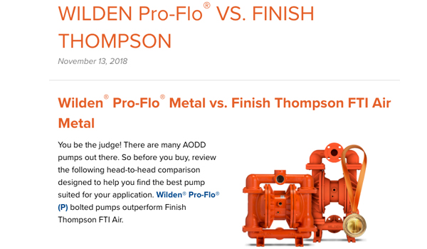 A new post is available on the Wilden Comparison Central site that illustrates how Wilden Pro-Flo SHIFT (PS) pumps outperform Finish Thompson FTI Air Pumps. The new post compares max flow, efficiency, parts count and operating costs. By providing this comparison, this post has been designed to help you decide which pump is best suited for your application.