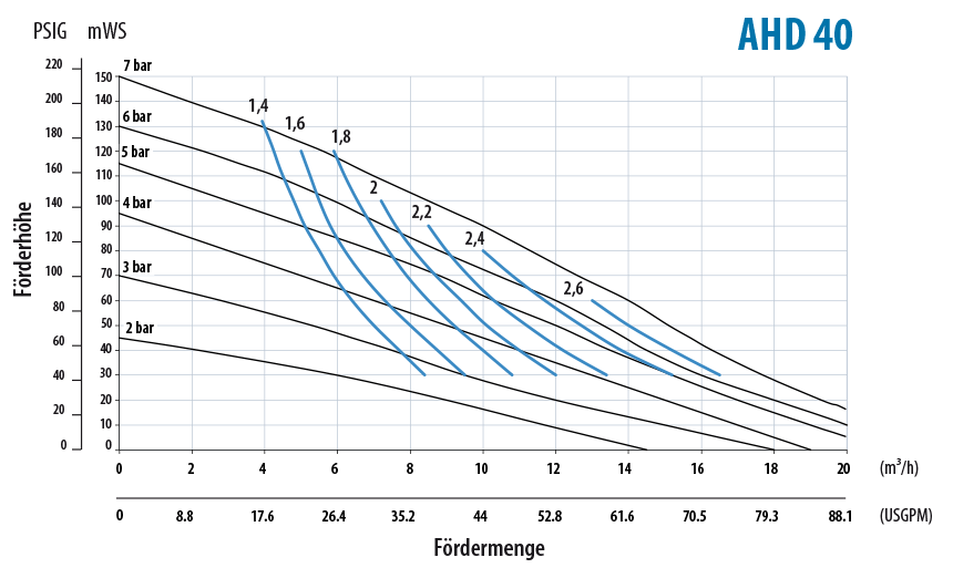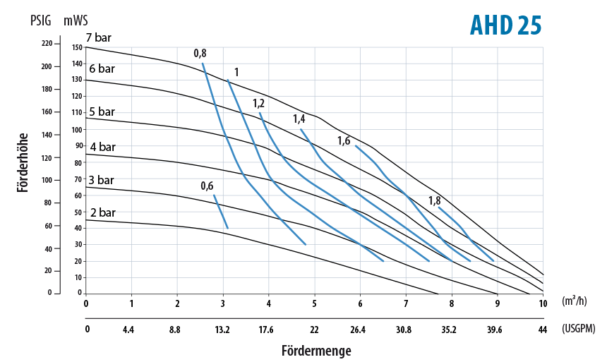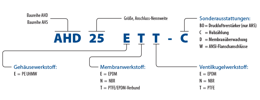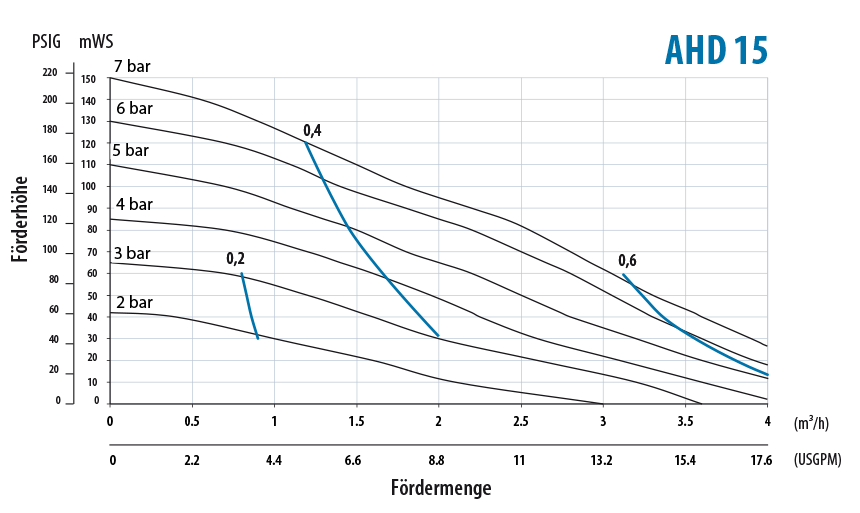 Die Hochdruck-Membranpumpen der Baureihe AHD verfügen über eine interne Druckübersetzung. Sie erzielen bei einem Antriebsdruck von max. 7 bar durch die innere Druckübersetzung einen Förderdruck von 15 bar. Das „D“ in AHD steht für Duplex, also die Verstärkung des Antriebsdrucks über die interne Druckerhöhung im Verhältnis von mehr als 2:1. Die Pumpen der Baureihe AHD sind in drei Baugrößen mit maximalen Fördermengen von 4 m³/h (AHD 15), 10 m³/h (AHD 25) und 20 m³/h (AHD 40) erhältlich.