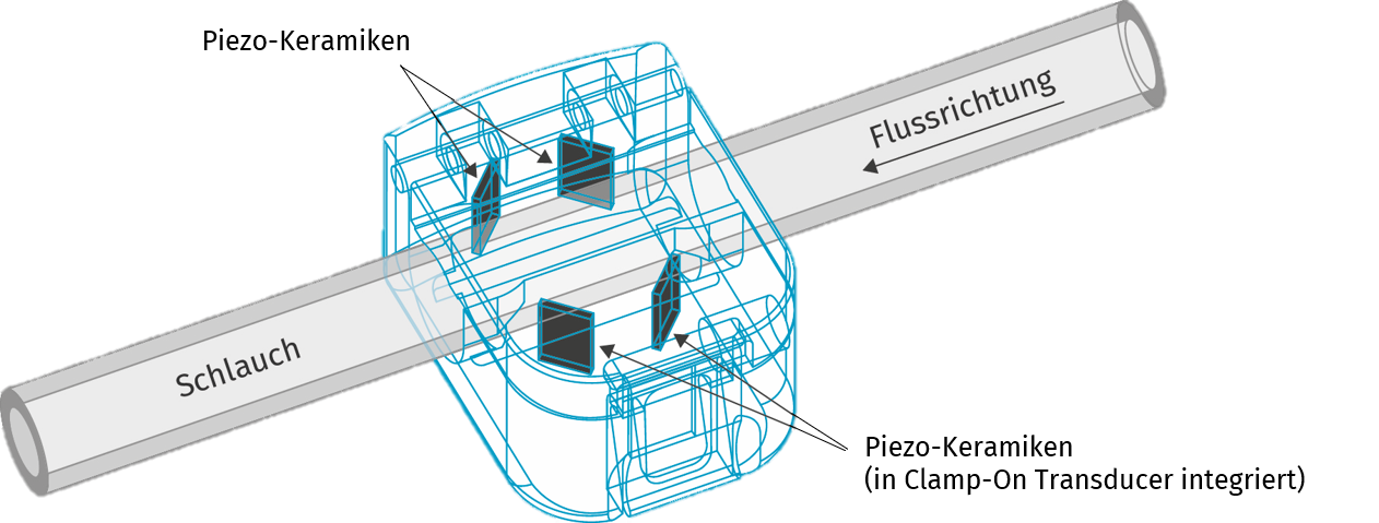 Um eine höhere Genauigkeit zu gewährleisten bestehen unsere Clamp-On Transducer aus jeweils zwei Schallwandlerpaaren. Diese bestehen aus insgesamt vier Piezokeramiken, die in einer X-Konfiguration um den Schlauch mit dem zu messenden Fluss angeordnet sind.