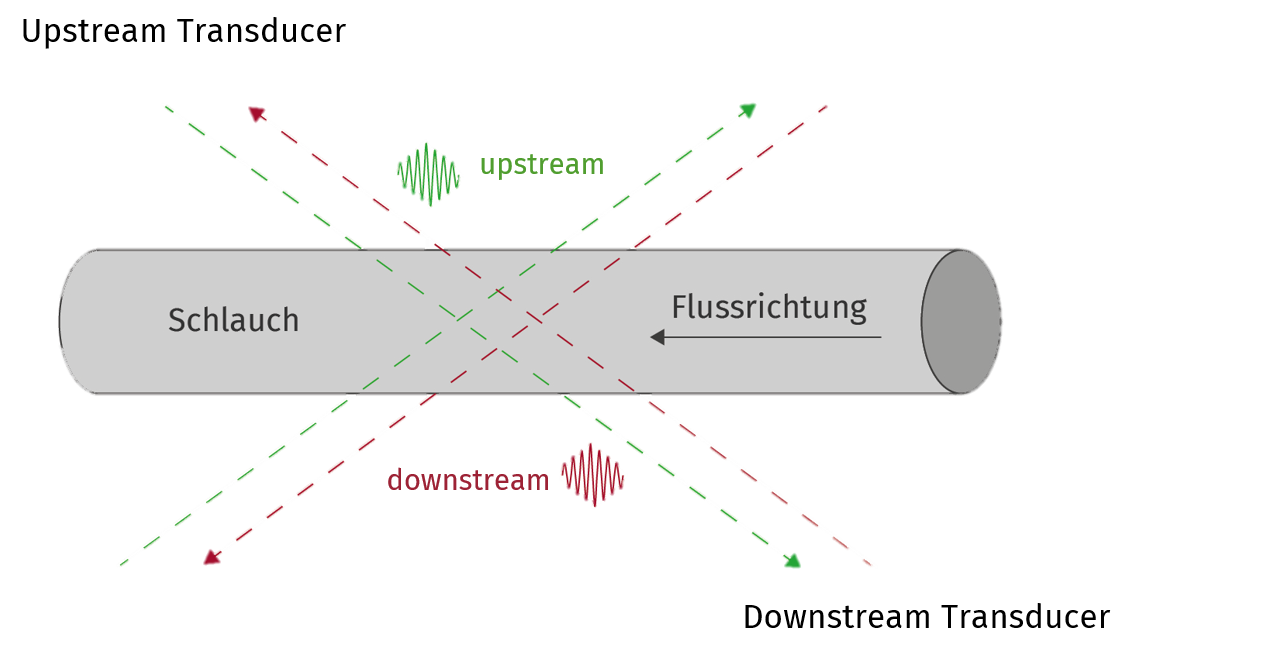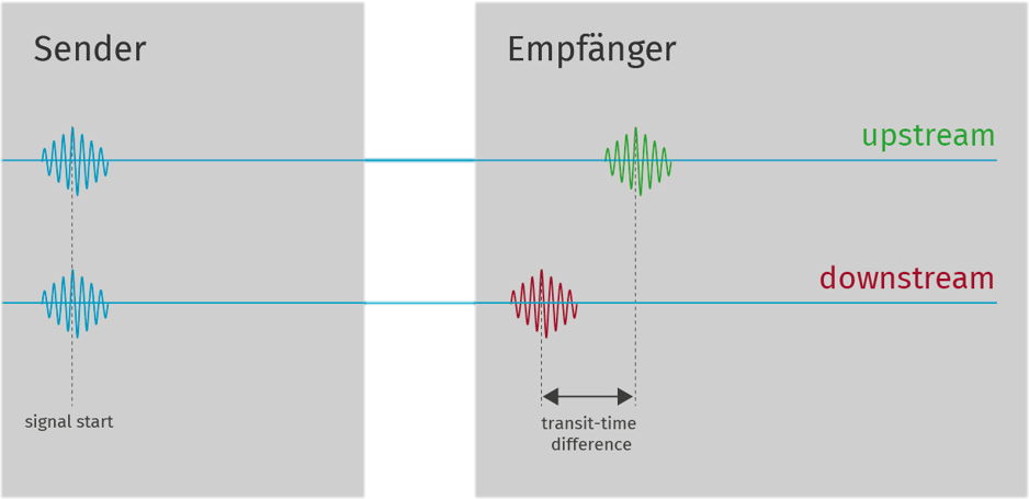 em-tecs nicht-invasive Messmethode basiert auf dem Ultraschall Laufzeitdifferenzverfahren. Diese Methode ermittelt die Laufzeitdifferenz von Ultraschallsignalen durch einer Messstrecke und wird dazu genutzt volumetrische Durchflussraten zu messen.