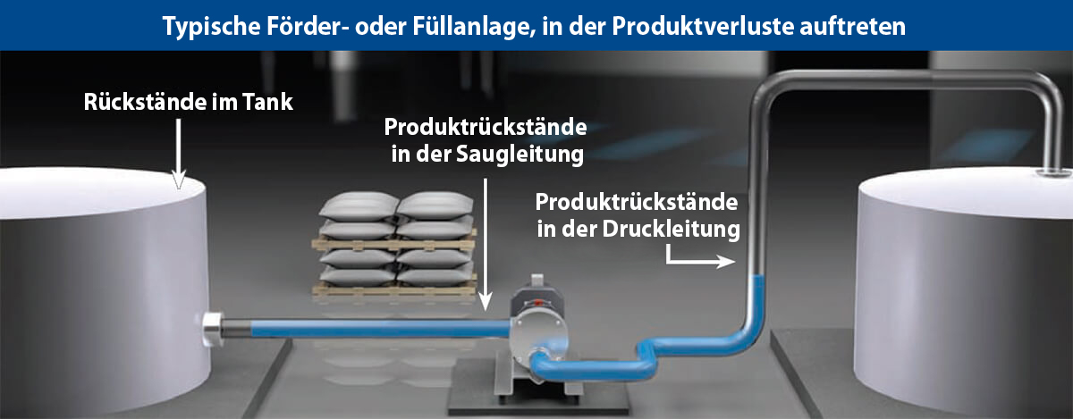 Pumpentechnologien wie Drehkolben- und Kreiskolbenpumpen, Kreiselpumpen, Schlauchpumpen und Exzenterschneckenpumpen werden häufig gewählt, um den Transfer von Rohstoffen und Endprodukten zu organisieren. Diese Pumpen sind jedoch nicht in der Lage, die Leitungen ausreichend zu entleeren. Bei der Produktrückgewinnung geht es also darum, wertvolle Produkte aus den Leitungen herauszuholen, die noch verwendet werden können. Herkömmliche Pumpentechnologien können diese Aufgabe oft nicht zufriedenstellend erfüllen. Aber mit der richtigen Pumpentechnologie gibt es die Lösung, eine Produktrückgewinnungsrate von 60 bis 80 % zu erreichen.