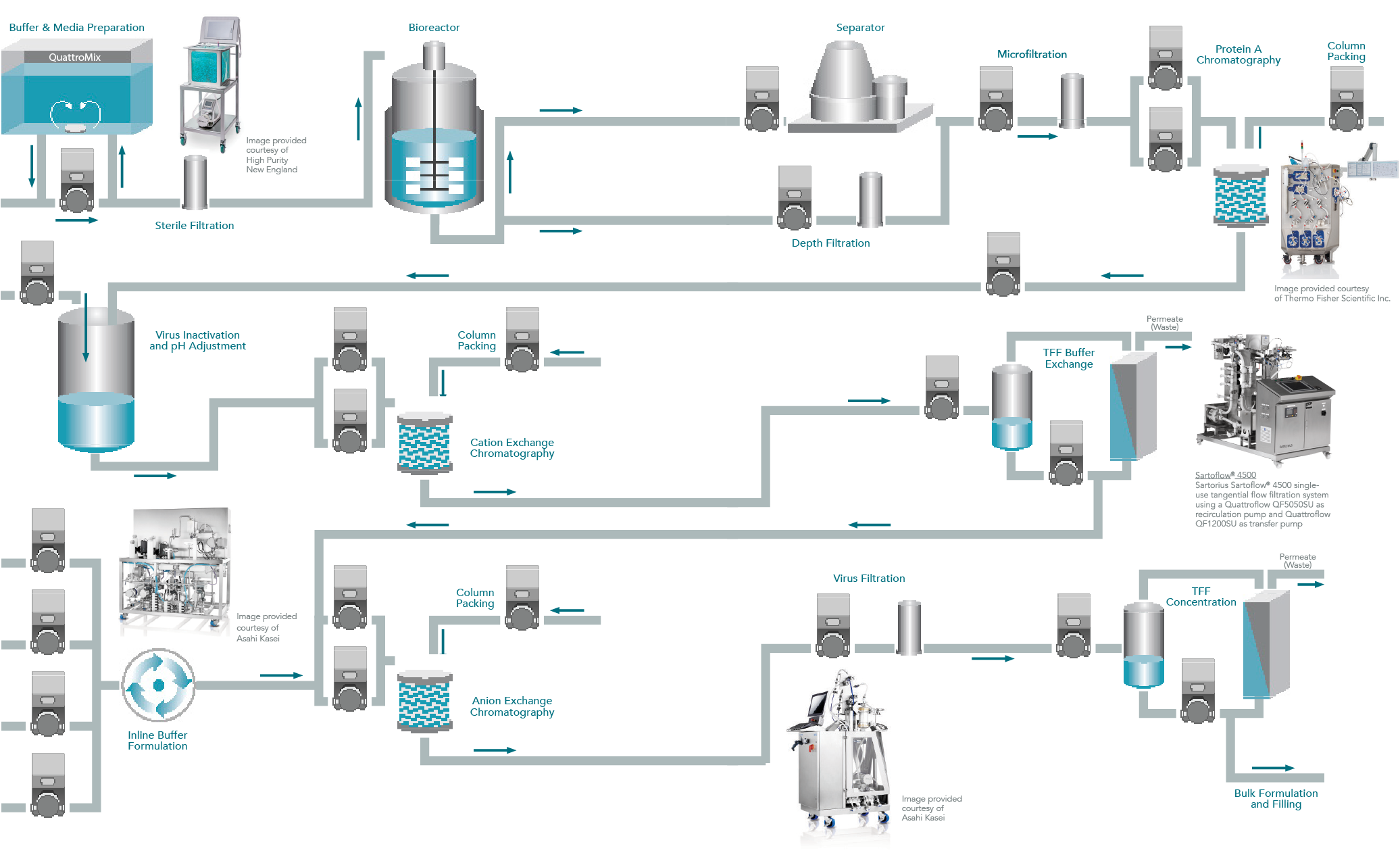 It involves a combination of upstream and downstream processing steps, which can vary depending on the product being created, the type of biological sources being used, and the desired quality and quantity of the final product.