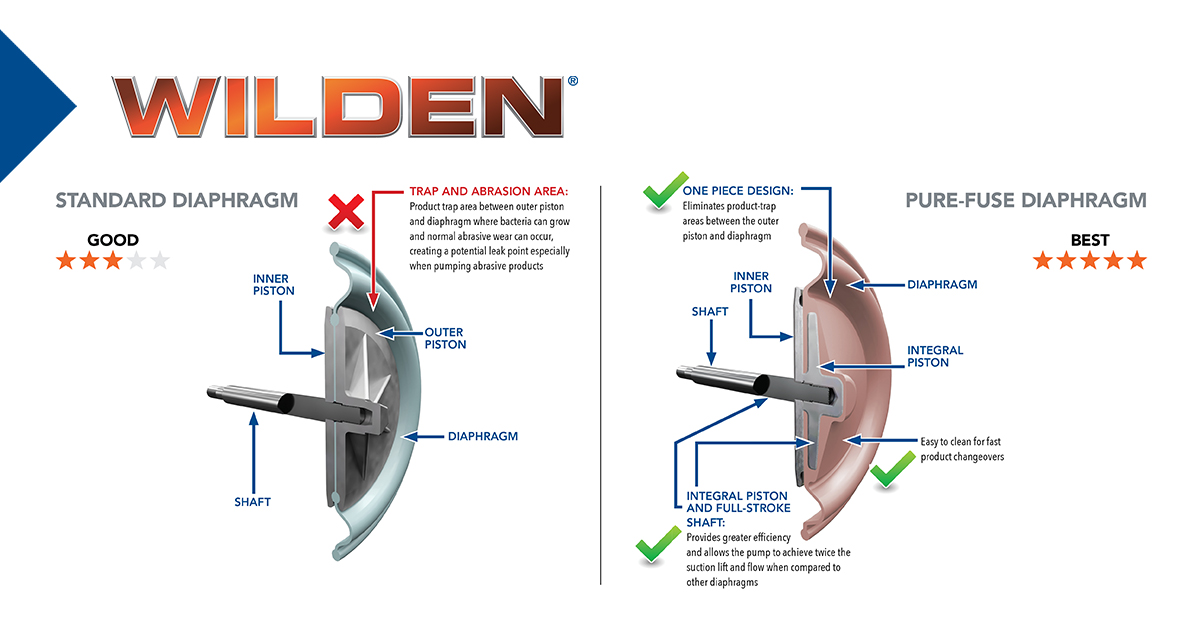 While conventional diaphragms that have an outer piston – which can be a trap area for product to nest and bacteria to grow – can compromise the integrity of the finished product, the construction of Pure-Fuse IPDs combines food-grade plastics and elastomers with a stainless-steel core that eliminates the need for an exposed outer piston. This revolutionary one-piece design encases the outer piston within the diaphragm material, resulting in a single continuous surface with no trap areas that can harbor bacteria. The design also eliminates the piston-diaphragm contact area where normal abrasive wear can cause the creation of leak points (which leads to costly product loss).